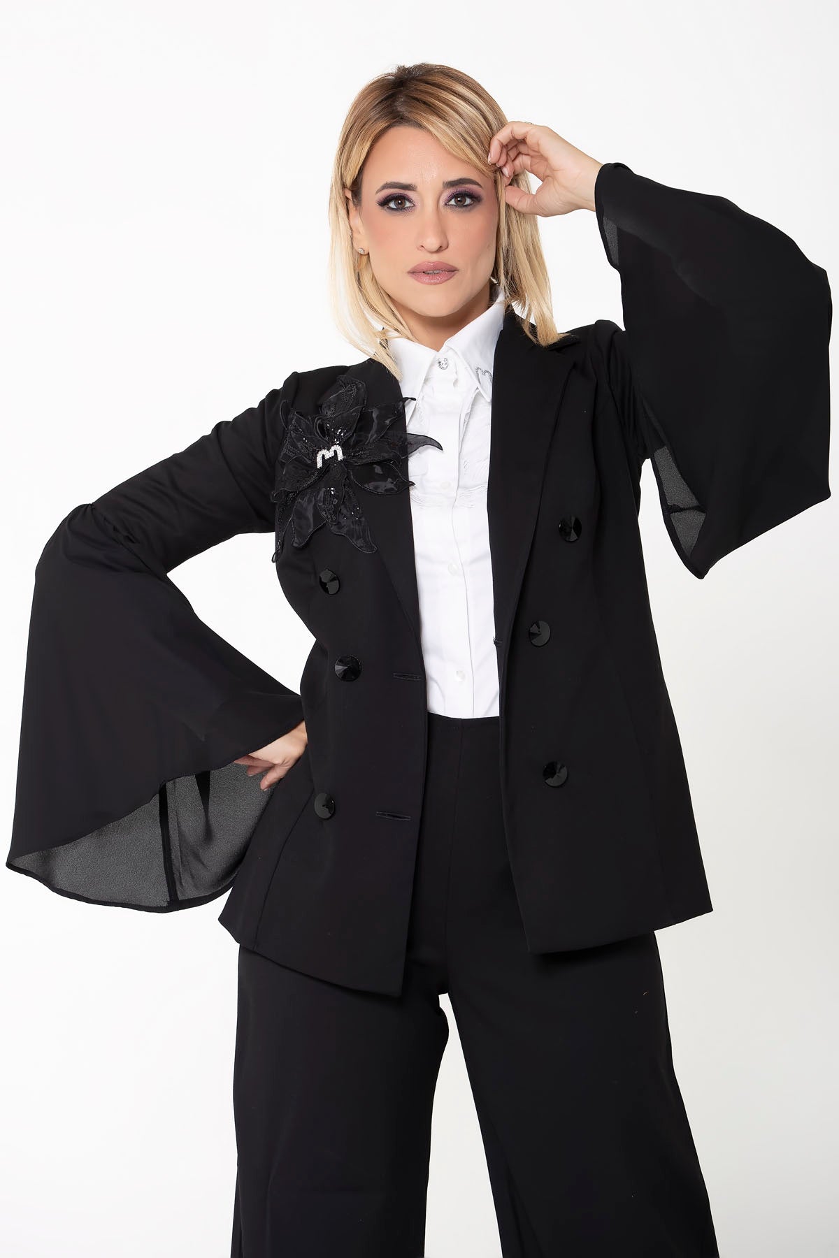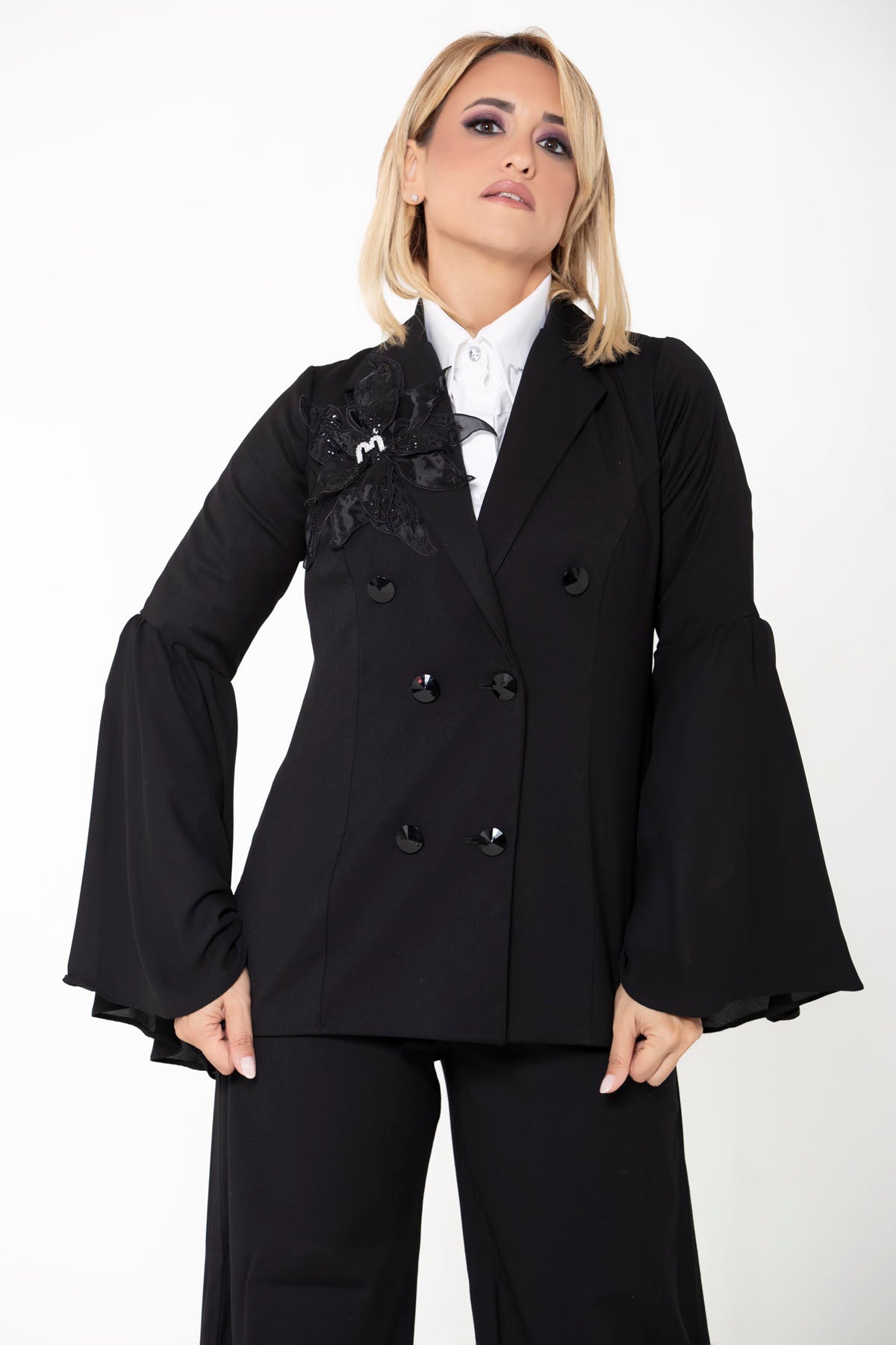 In viscosa misto lana una giacca importante per i vostri eventi con maniche ampie in georgette e fiore con paillettes ed M in strass.