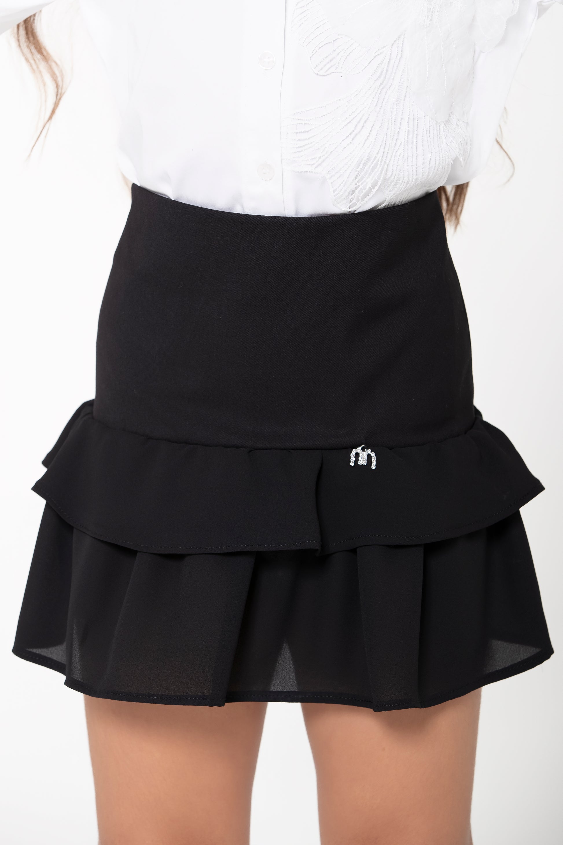 Gonnellina in viscosa misto lana con balze in georgette e charm strassato.