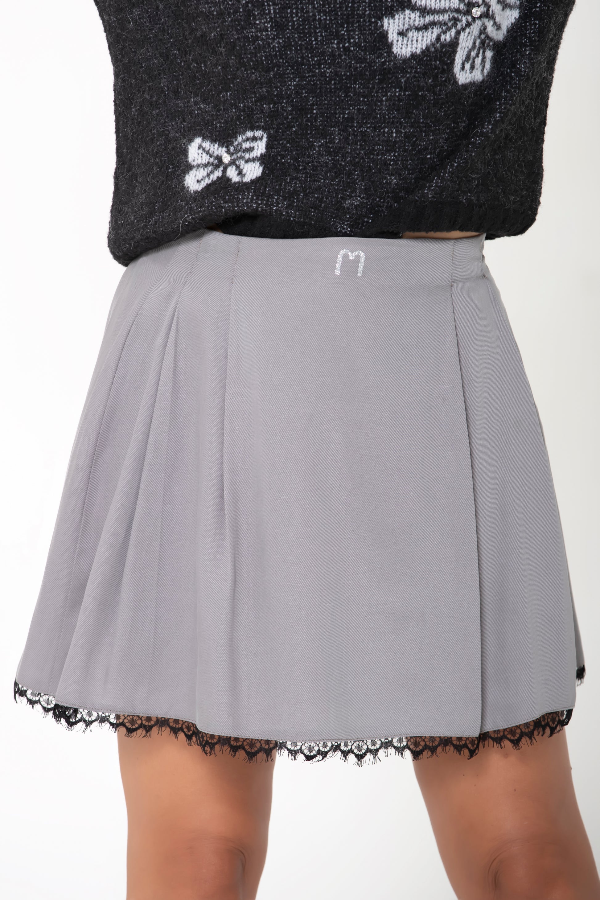 Gonnellina con piegoni e pizzo cigliato. Logo in argento lurex.