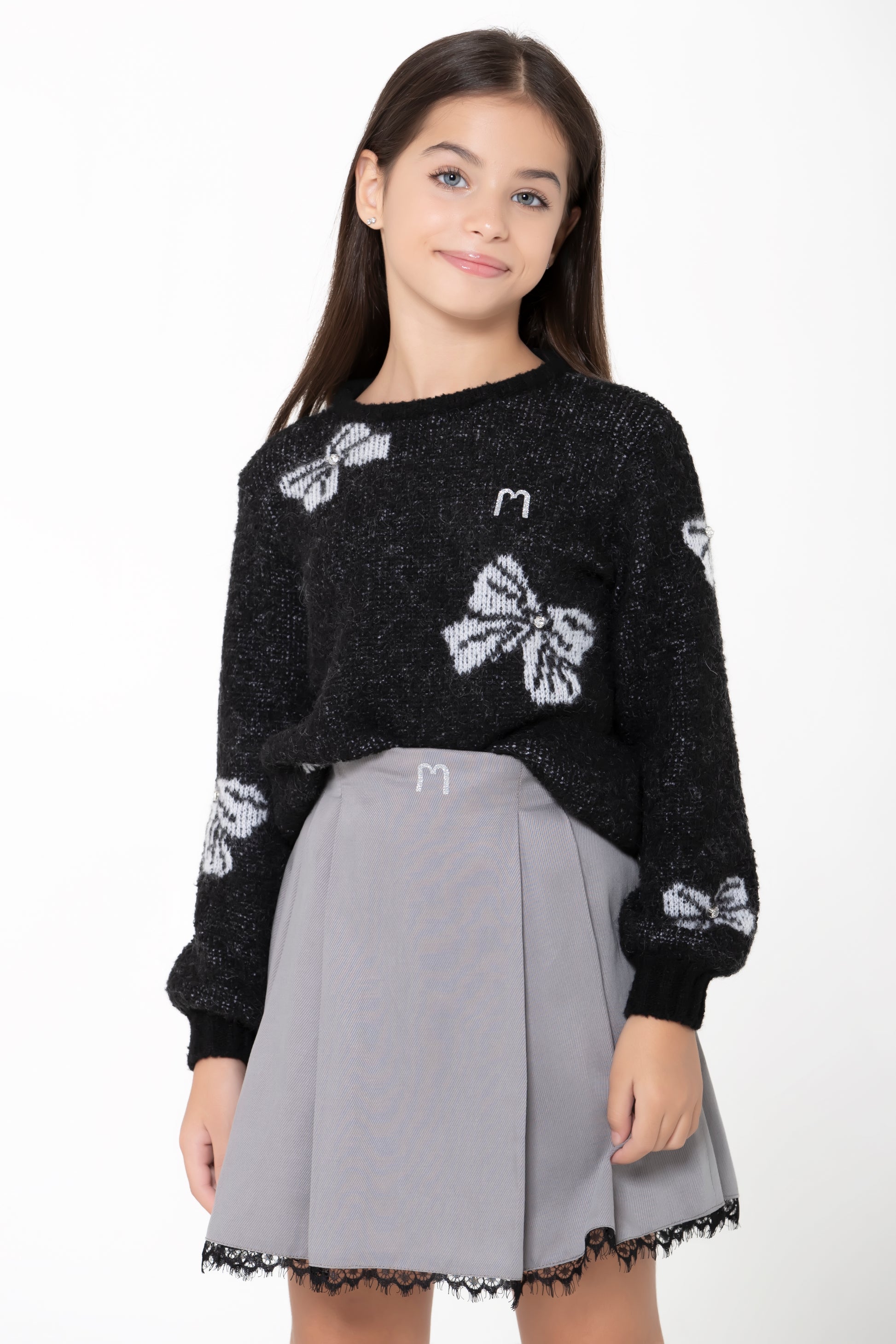 Gonna morbida con piegoni e rikfinitura con pizzo cigliato. Logo argento lurex