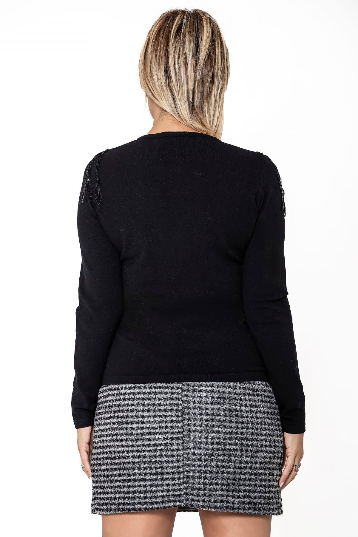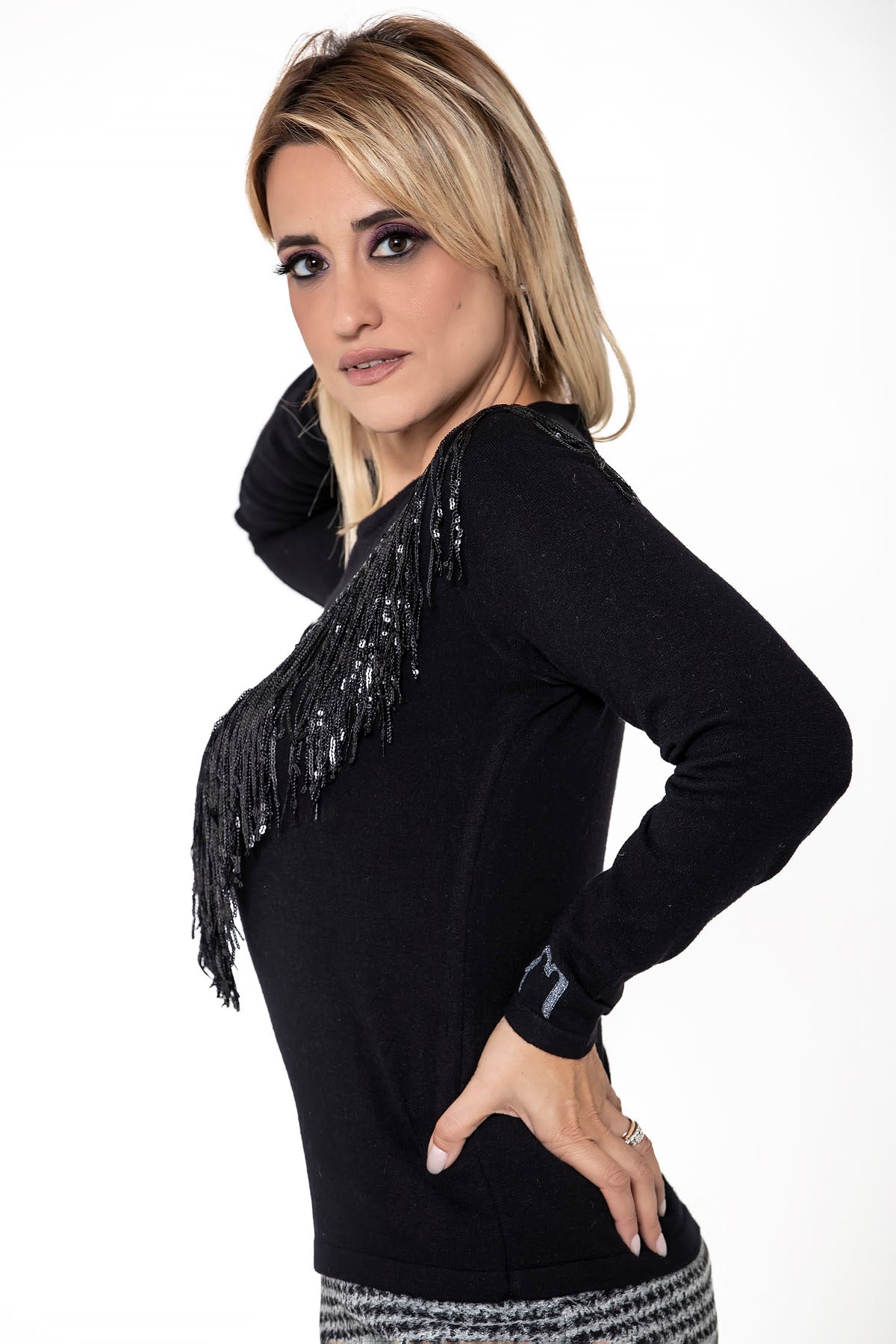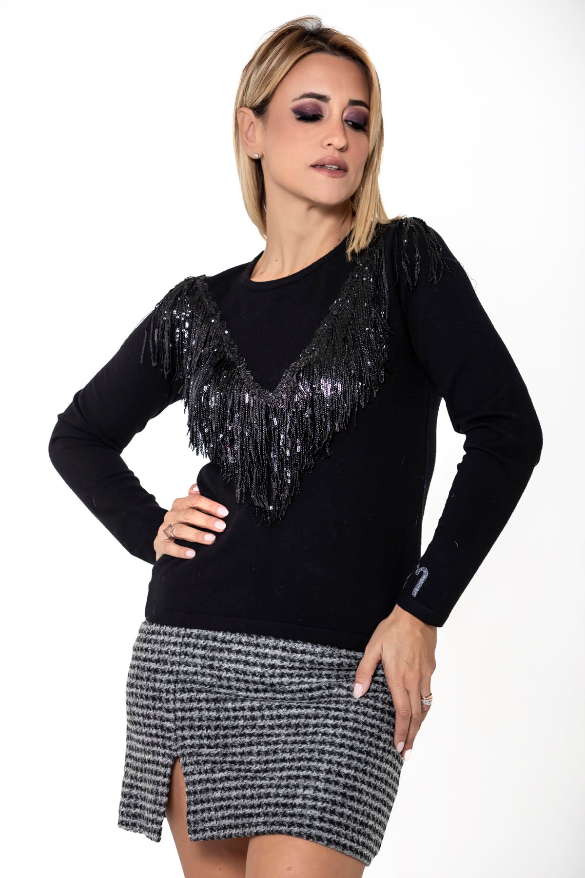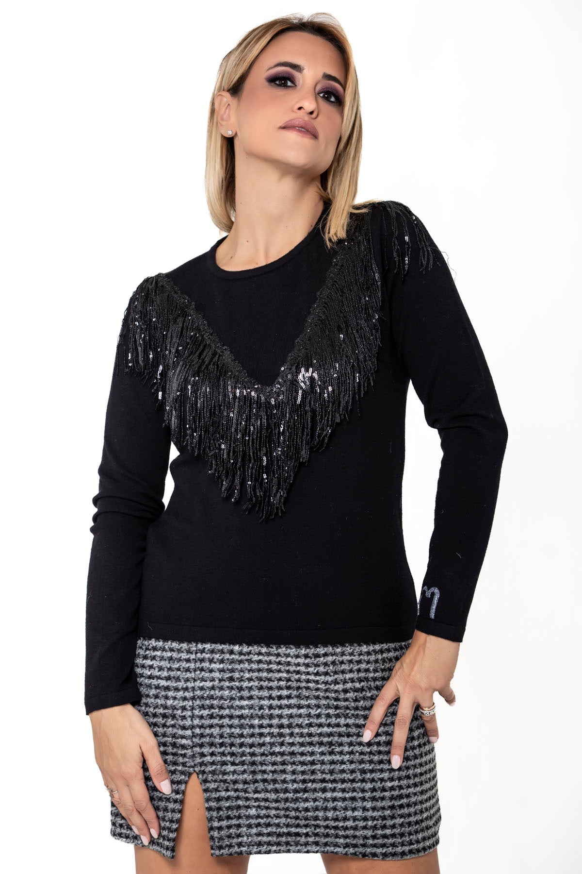Morbidissima maglia in lana elasticizzata con frange in paillettes e logo lurex al polso.