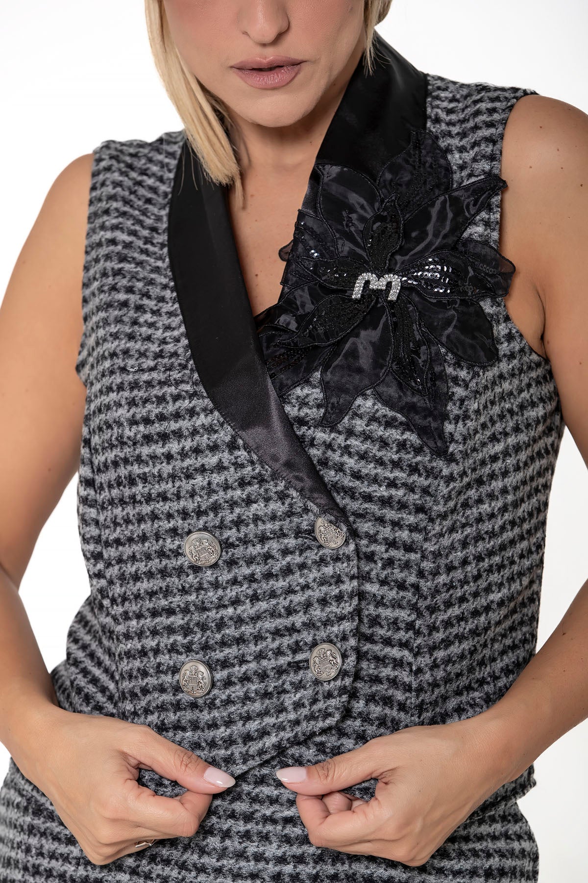 In misto lana un set composto da gilet doppio petto con reverse in raso e fiore gioiello e una gonna corta con spacco. Un tailleur diverso, sofisticato e femminile.