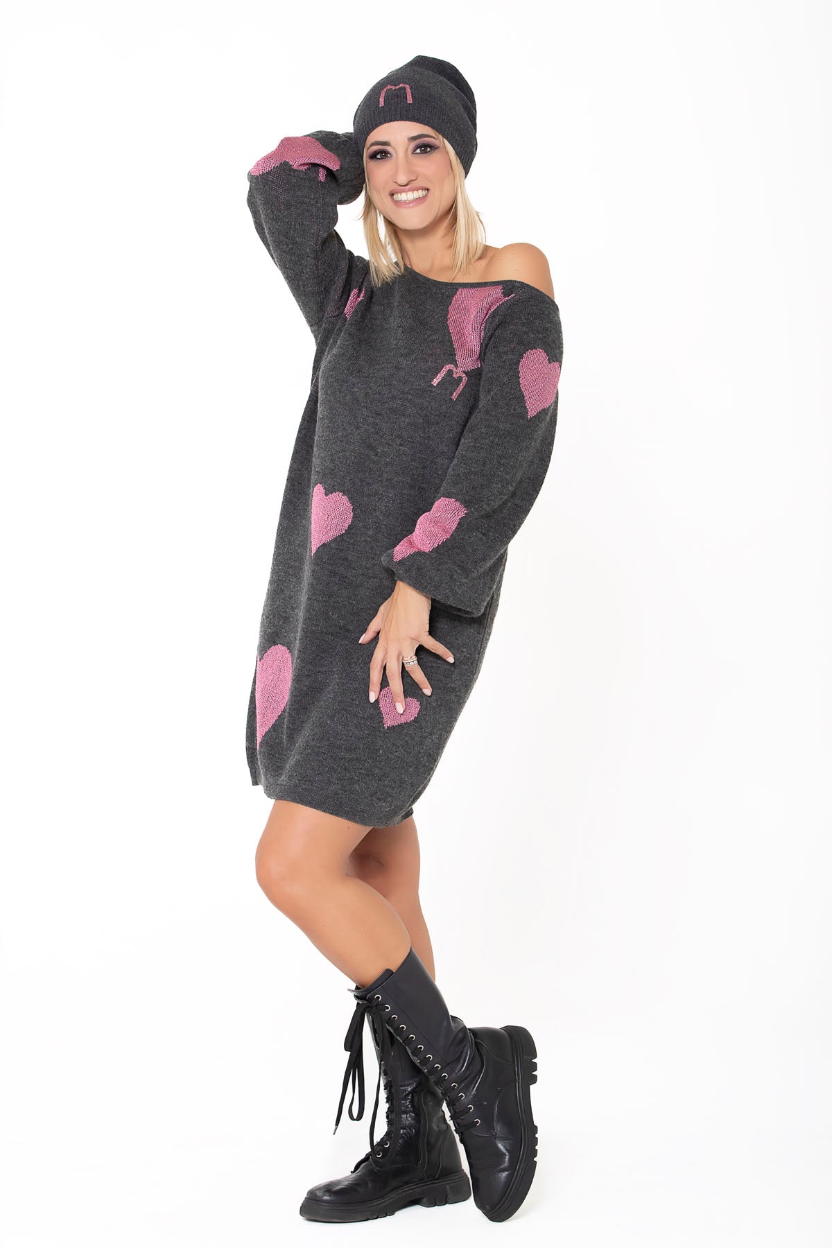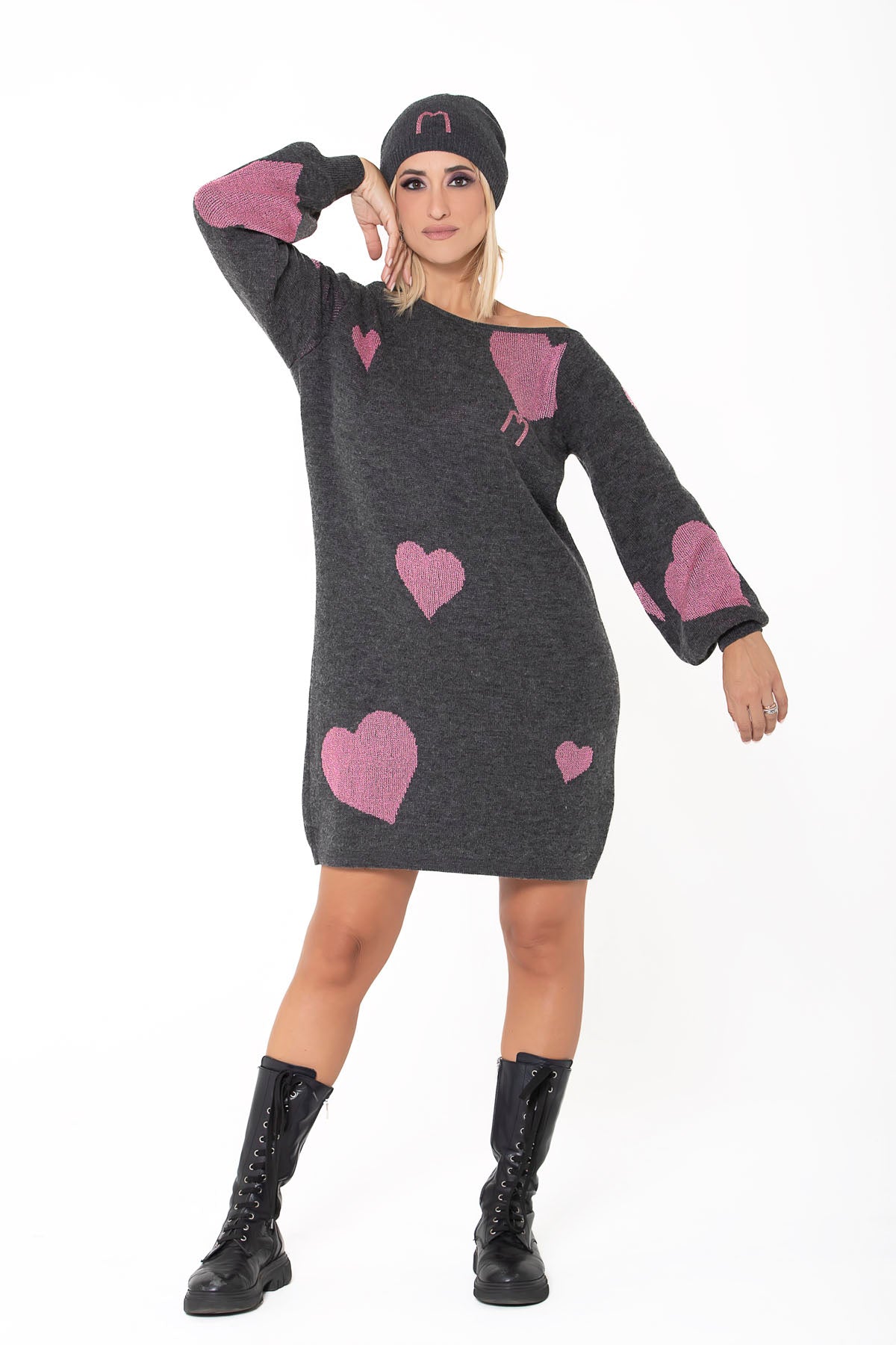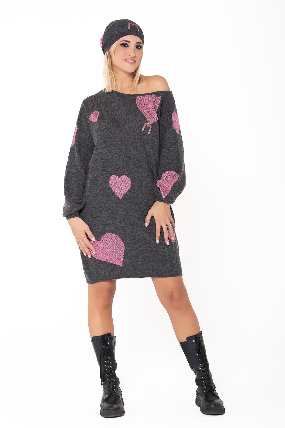 Maxipull in misto lana con cuori asimmetrici rosa lurex a contrasto, spalla scesa e logo rosa glitter. Maniche a sbuffo per unire casual a ricercato.