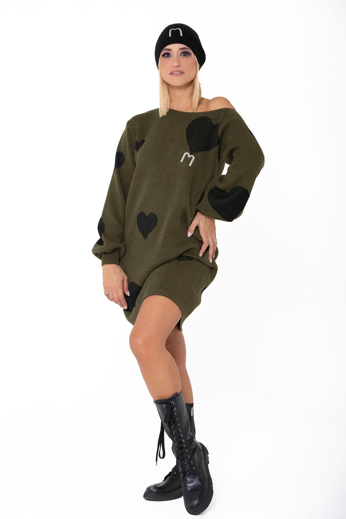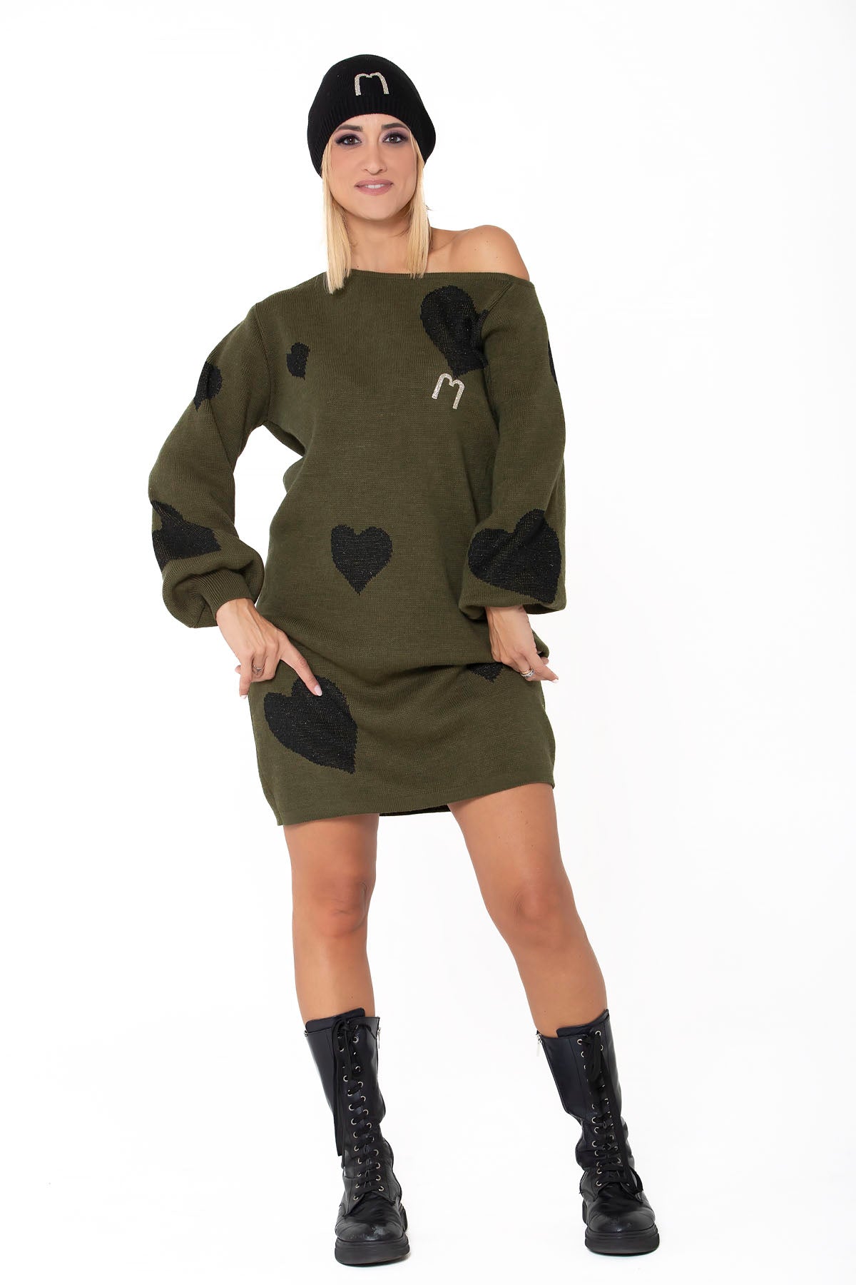 Maxipull in misto lana con cuori asimmetrici neri a contrasto, spalla scesa e logo champagne glitter. Maniche a sbuffo per unire casual a ricercato.
