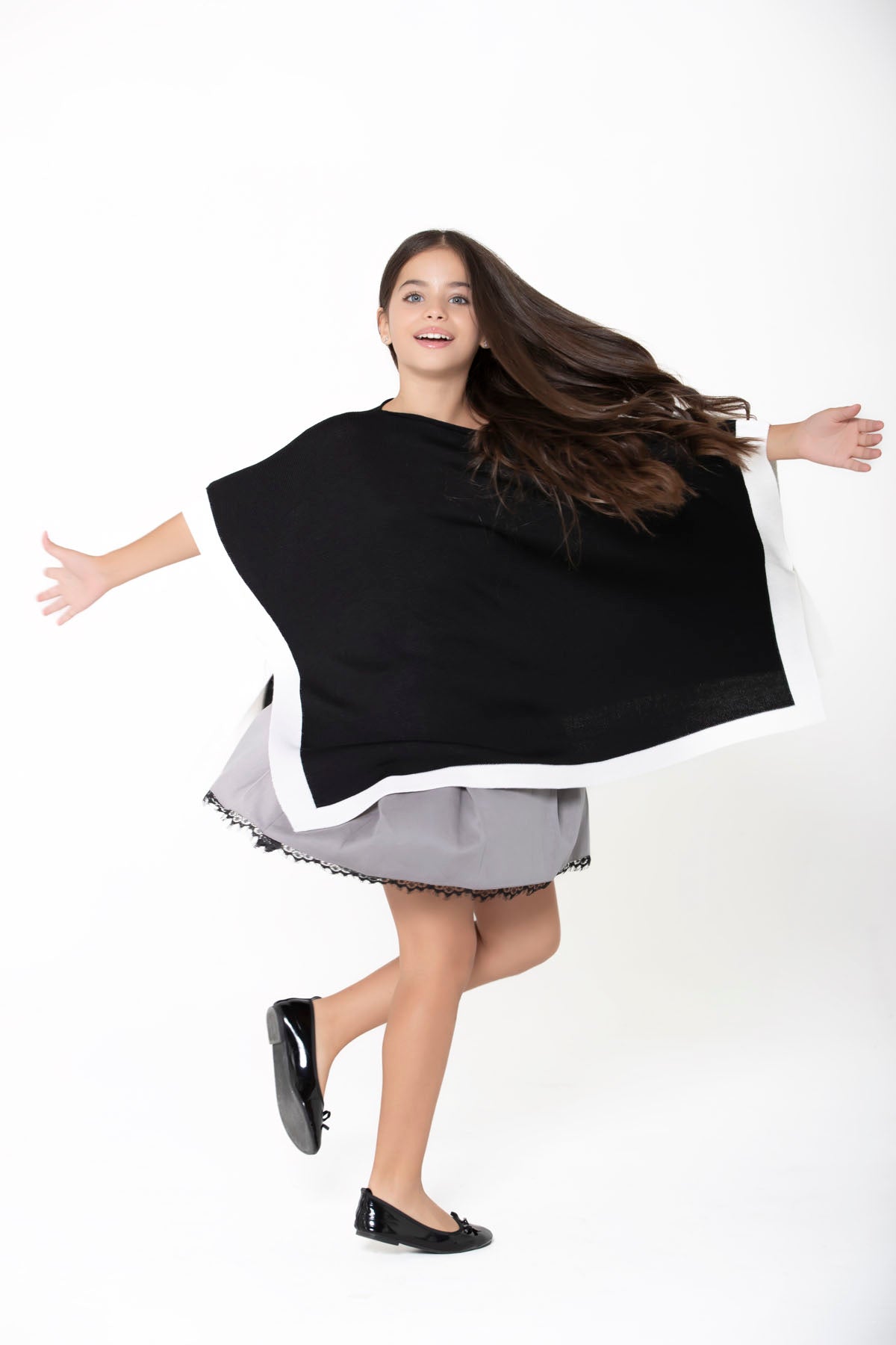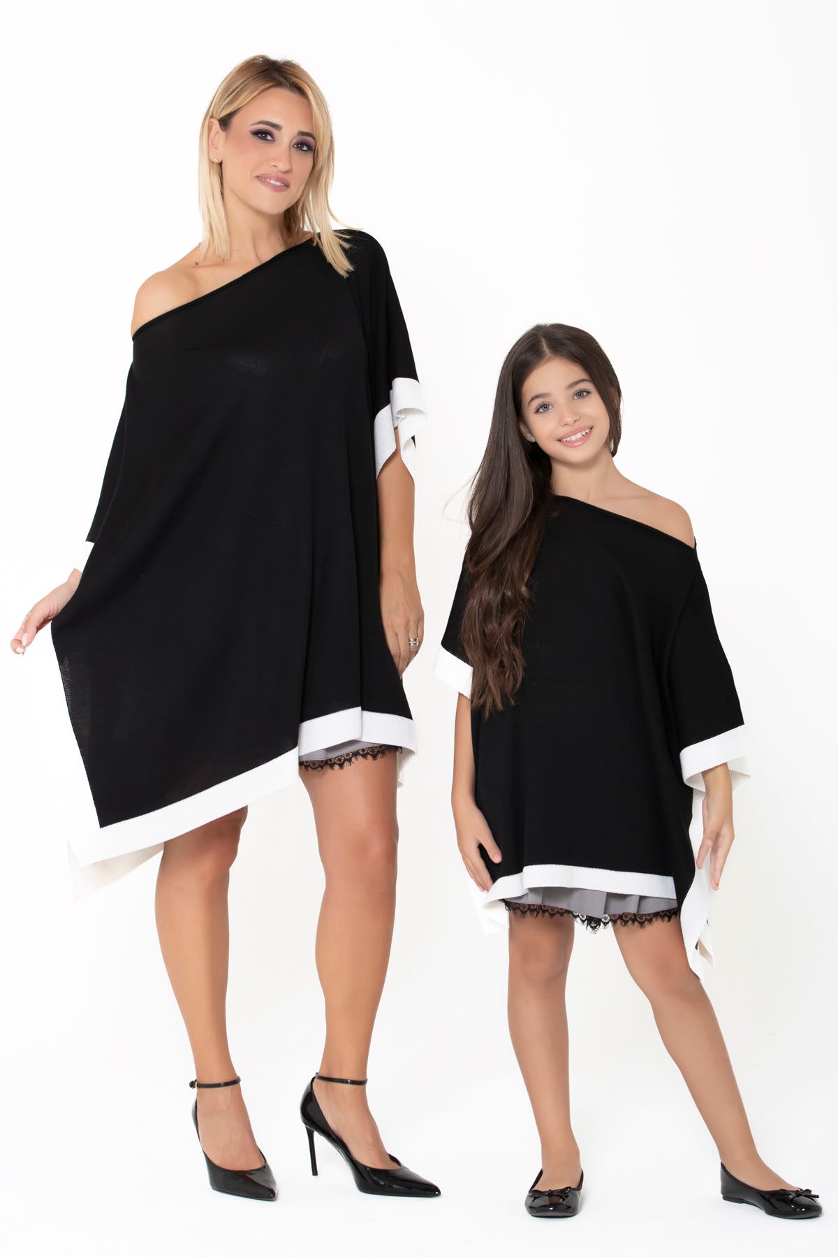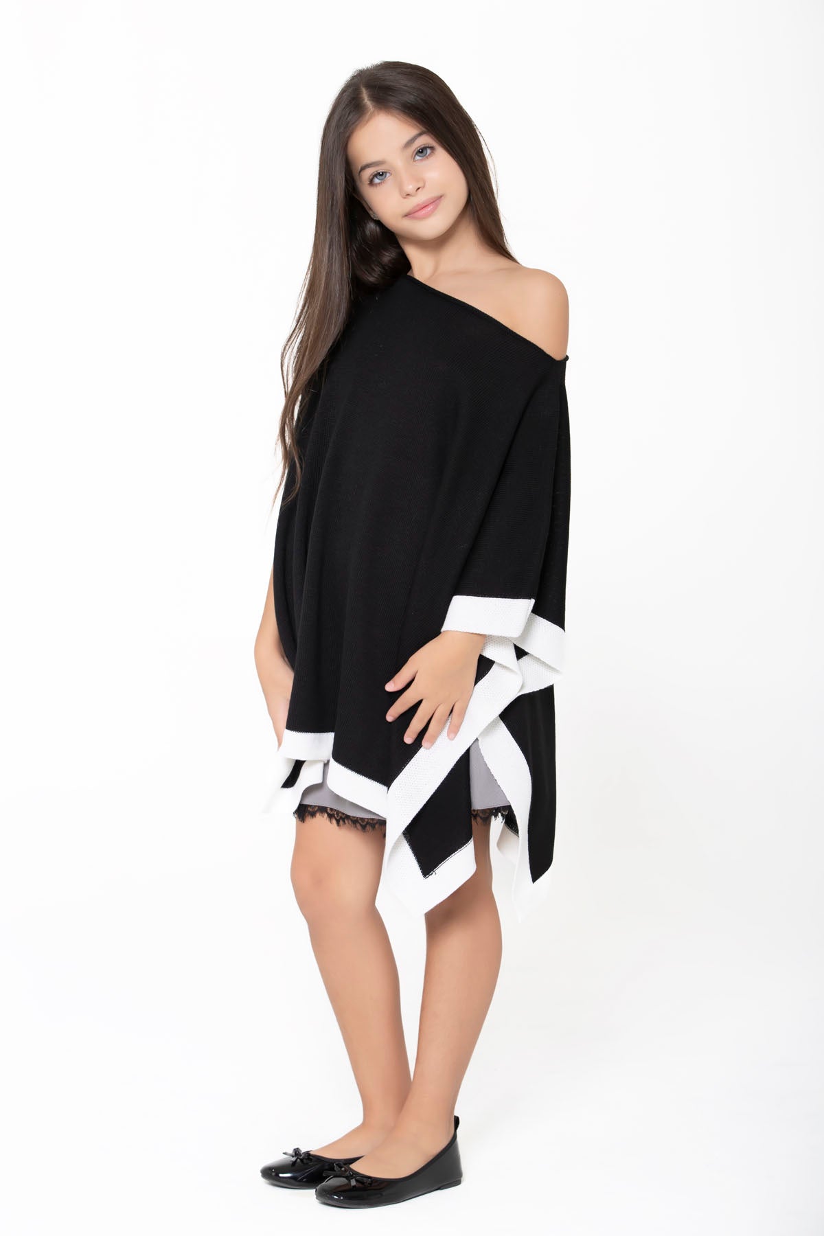 Elegante e raffinata questa mantella è in morbida lana con scollo a barca e fascia bianca a contrasto.
