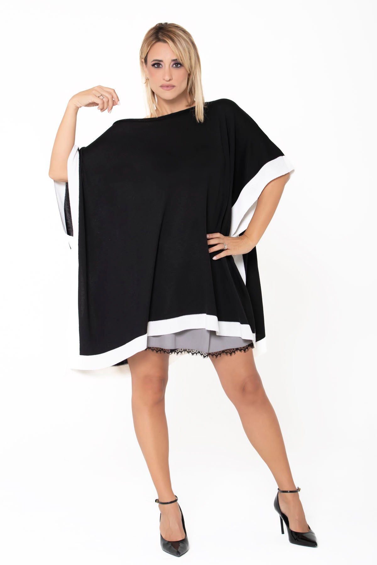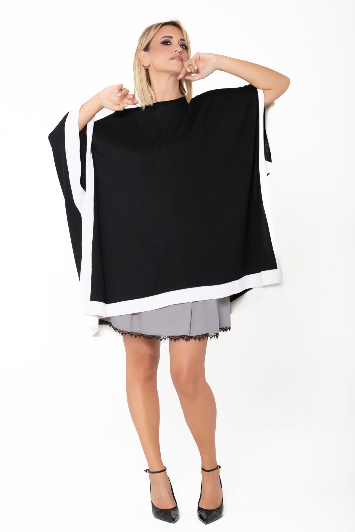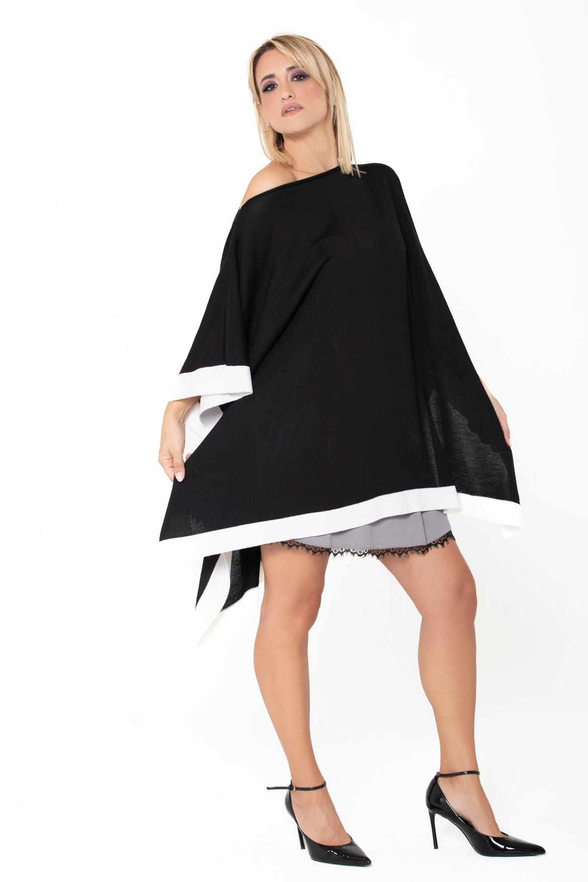 Una elegante e sofisticata mantella in morbidissima lana con scollo a barca e fascia a contrasto bianca.