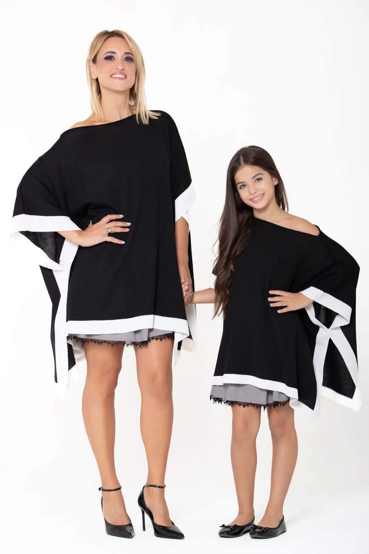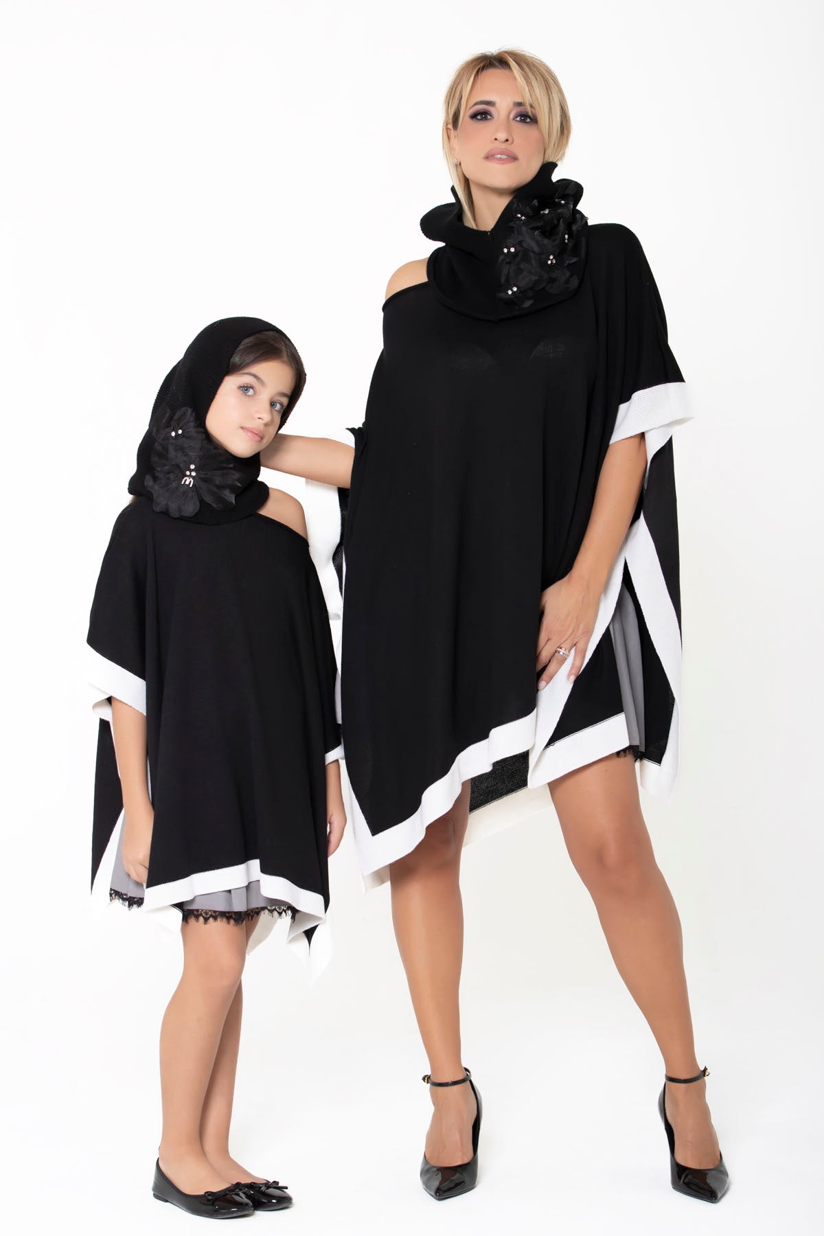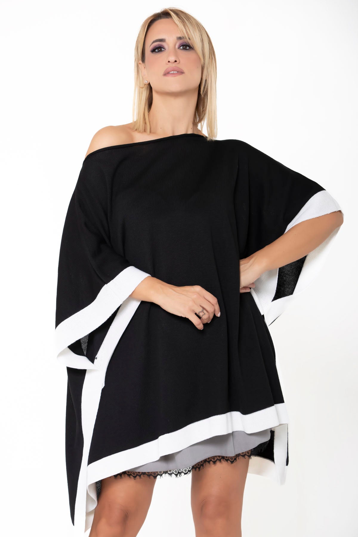 Una elegante e sofisticata mantella in morbidissima lana con scollo a barca e fascia a contrasto bianca.